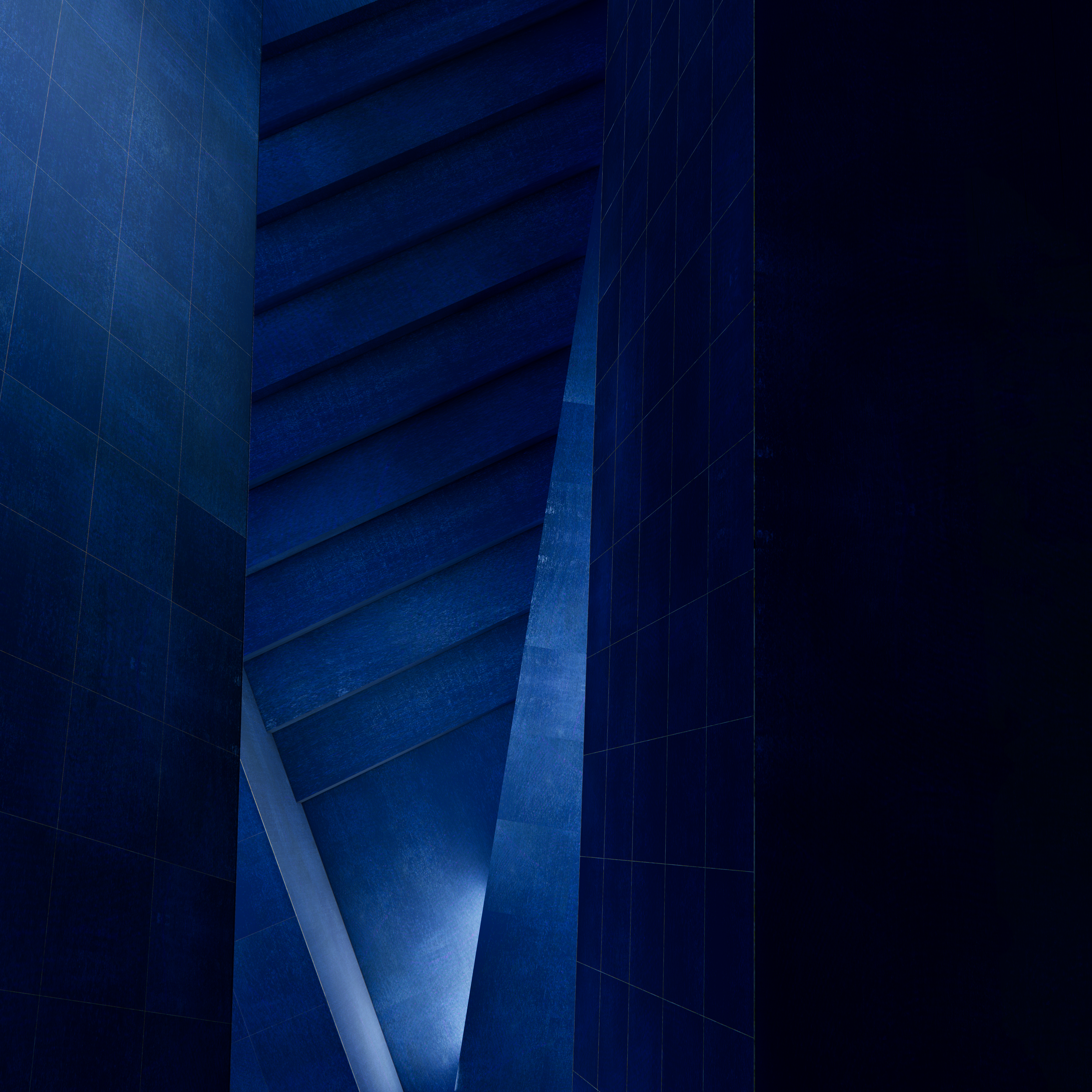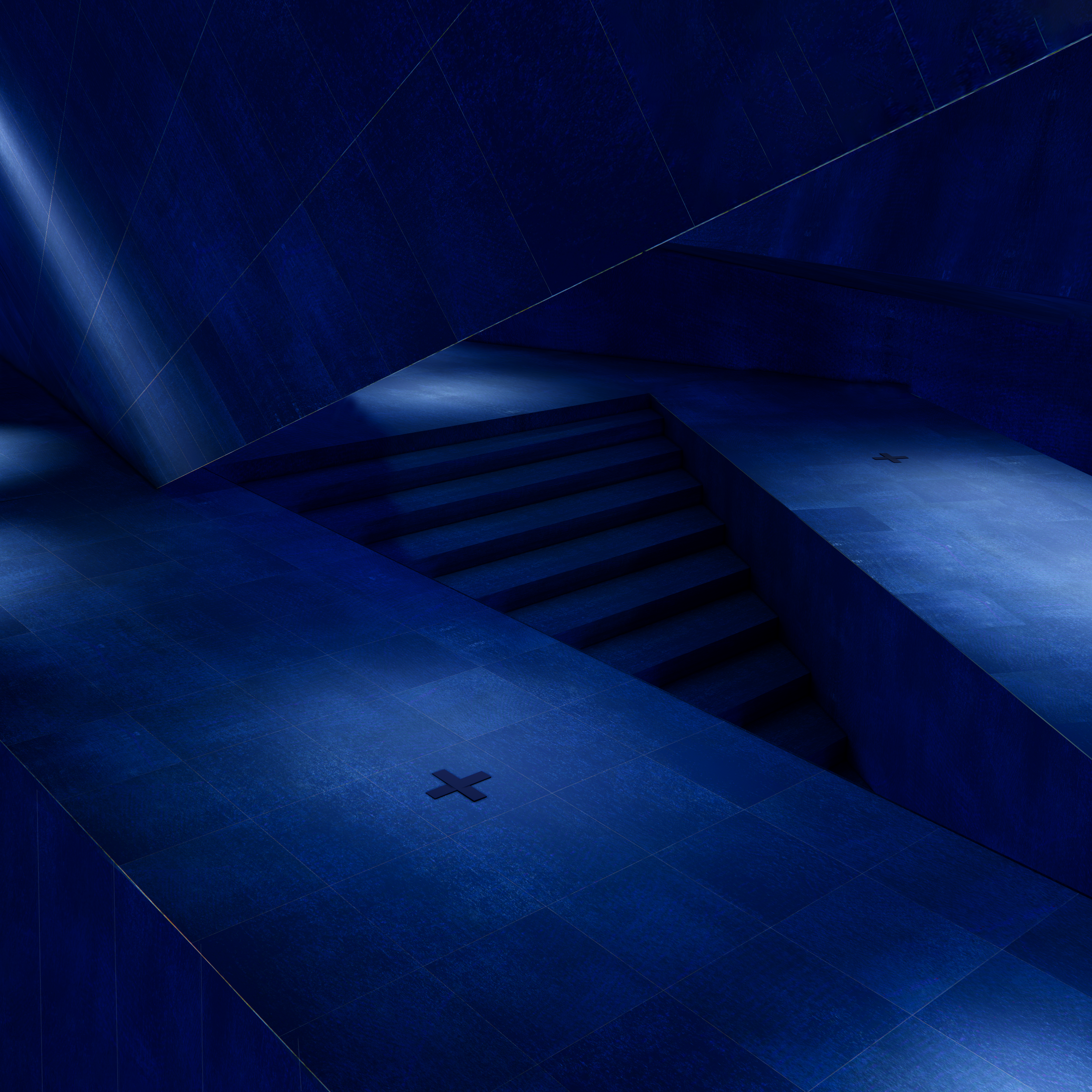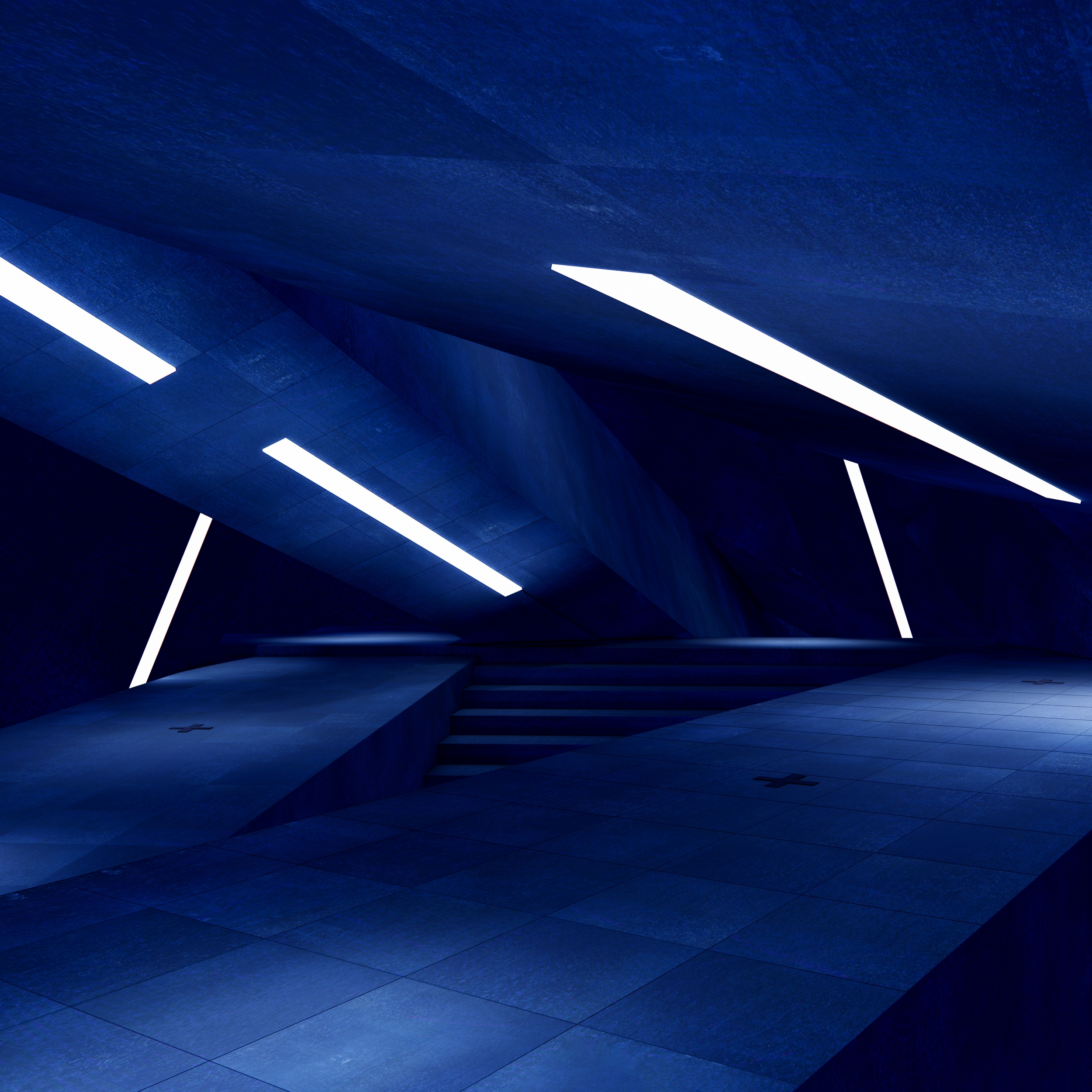 A dark denim blue environment illuminated with lights engrained in brutalist forms. Moments captured within intersections spills details of the sculptural architecture. Checkered finishes with silver linings takes obscure journeys in Denim Brutalism