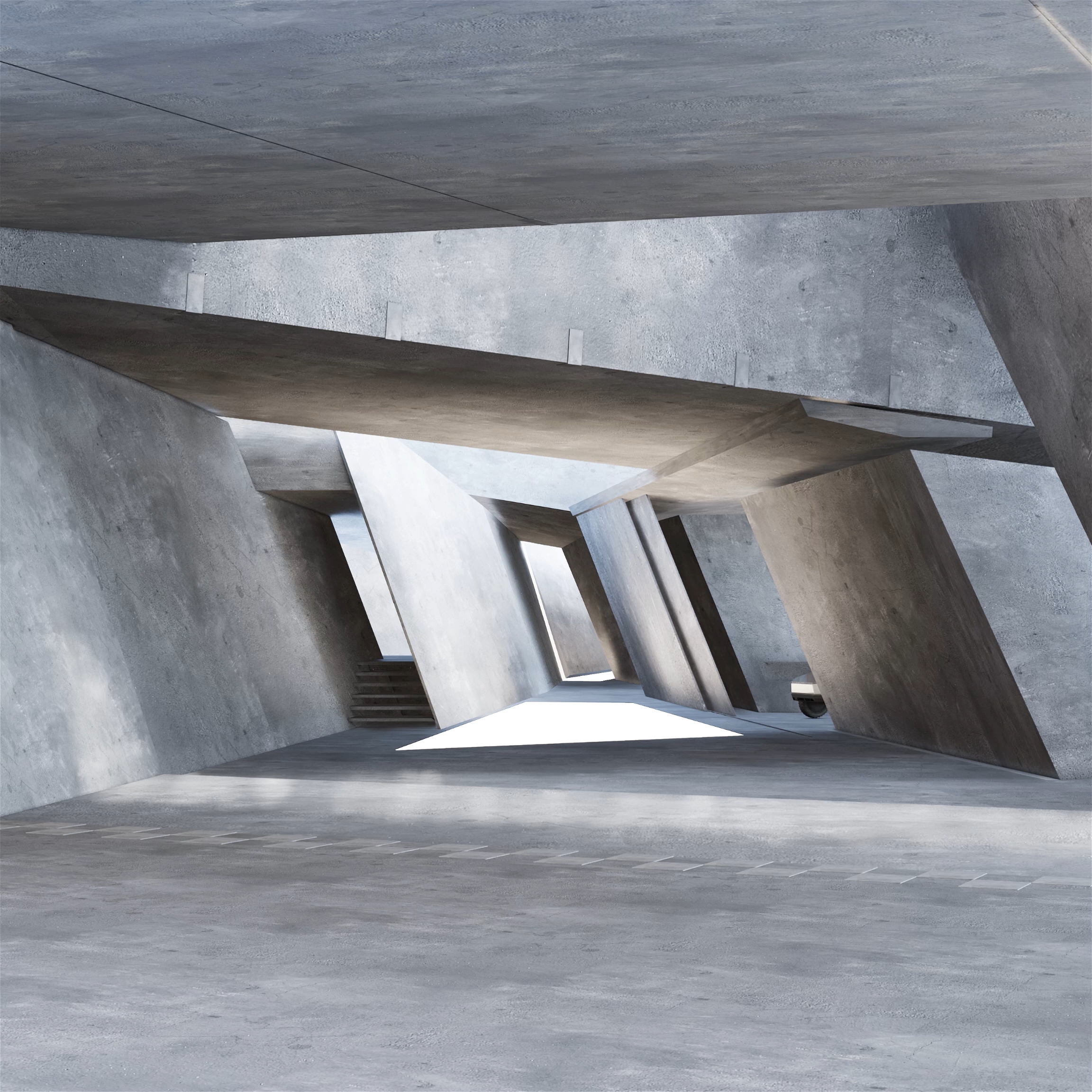Slanted rough concrete walls as raw as they are is a garage for your car. Captured as an exit into an equally mysterious space or maybe out of it. Garages are part of the journey regardless. Enjoy the ride.