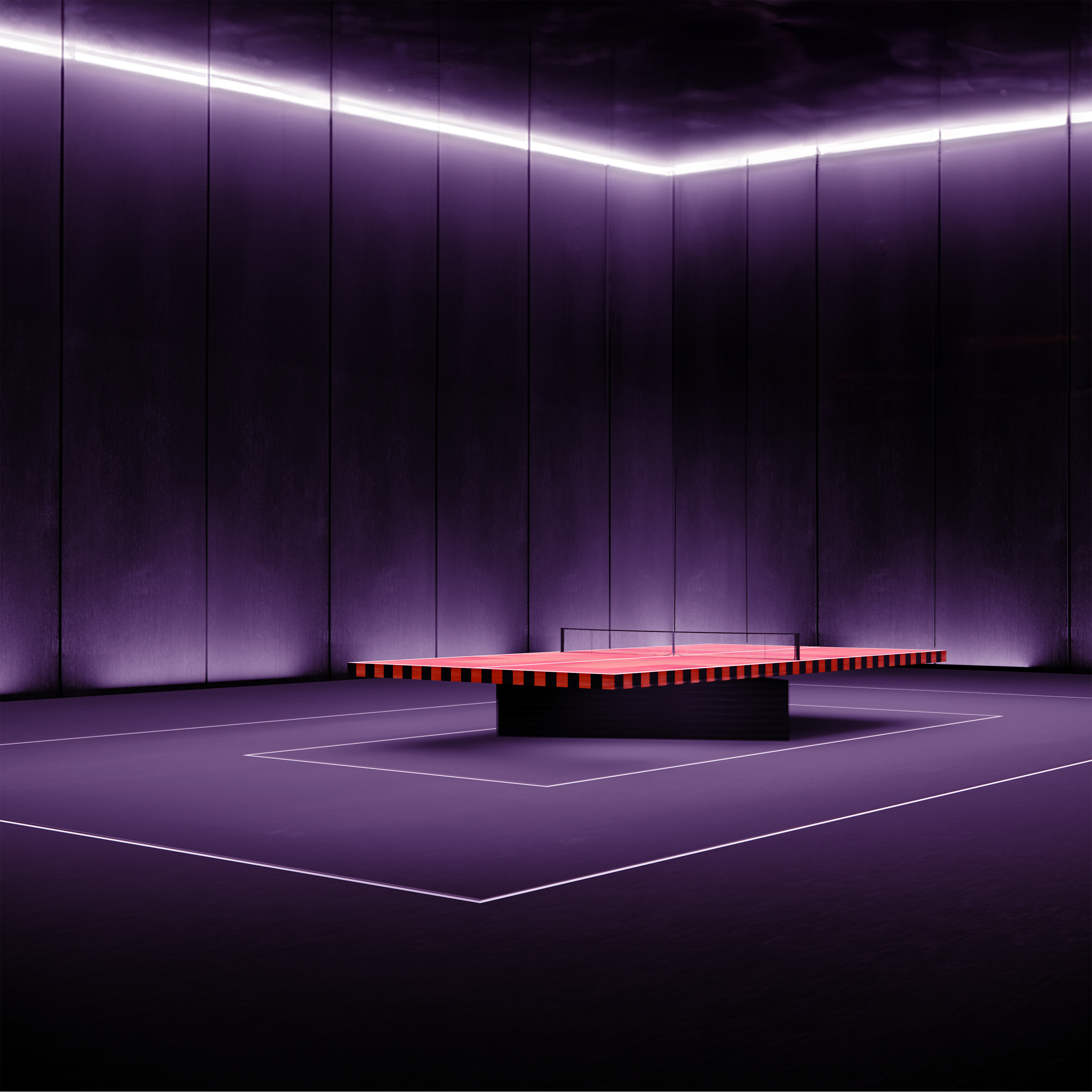 A monochromatic purple room with a red waffle ceiling light-well above a ping-pong table. Play is a form of constructive escapism, ping-pong as a recreational exit. Introducing Philippe table as an ode to my first mentor Philippe Baumann who took me into his studio when I was 20 and thought me that architecture comes with an edge. He loves ping pong, so does his son Oskar.