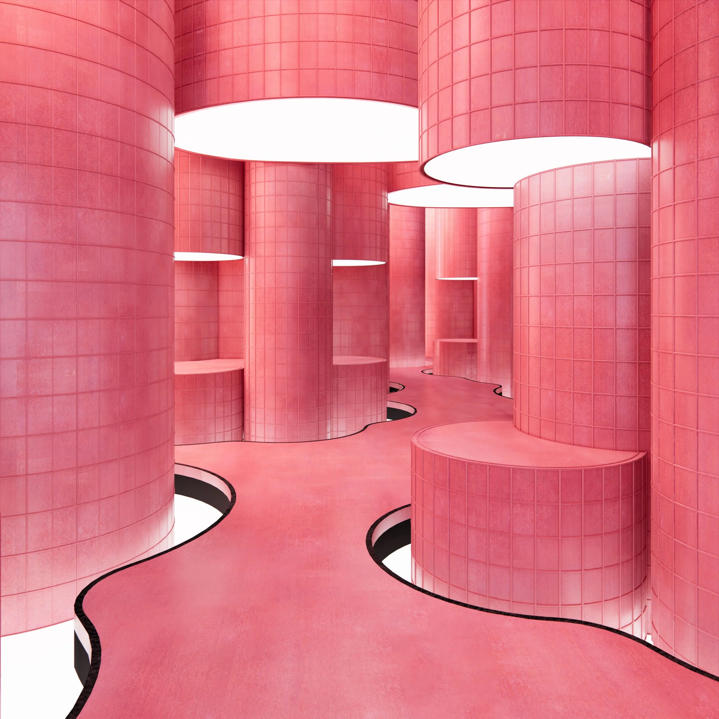 A maze built within a pile of pink silos is a display room for garment kinds. Quite playful with subtle graphic touches, the space is highlighted with a meandering pathway illuminated under the down-lit silo masses.