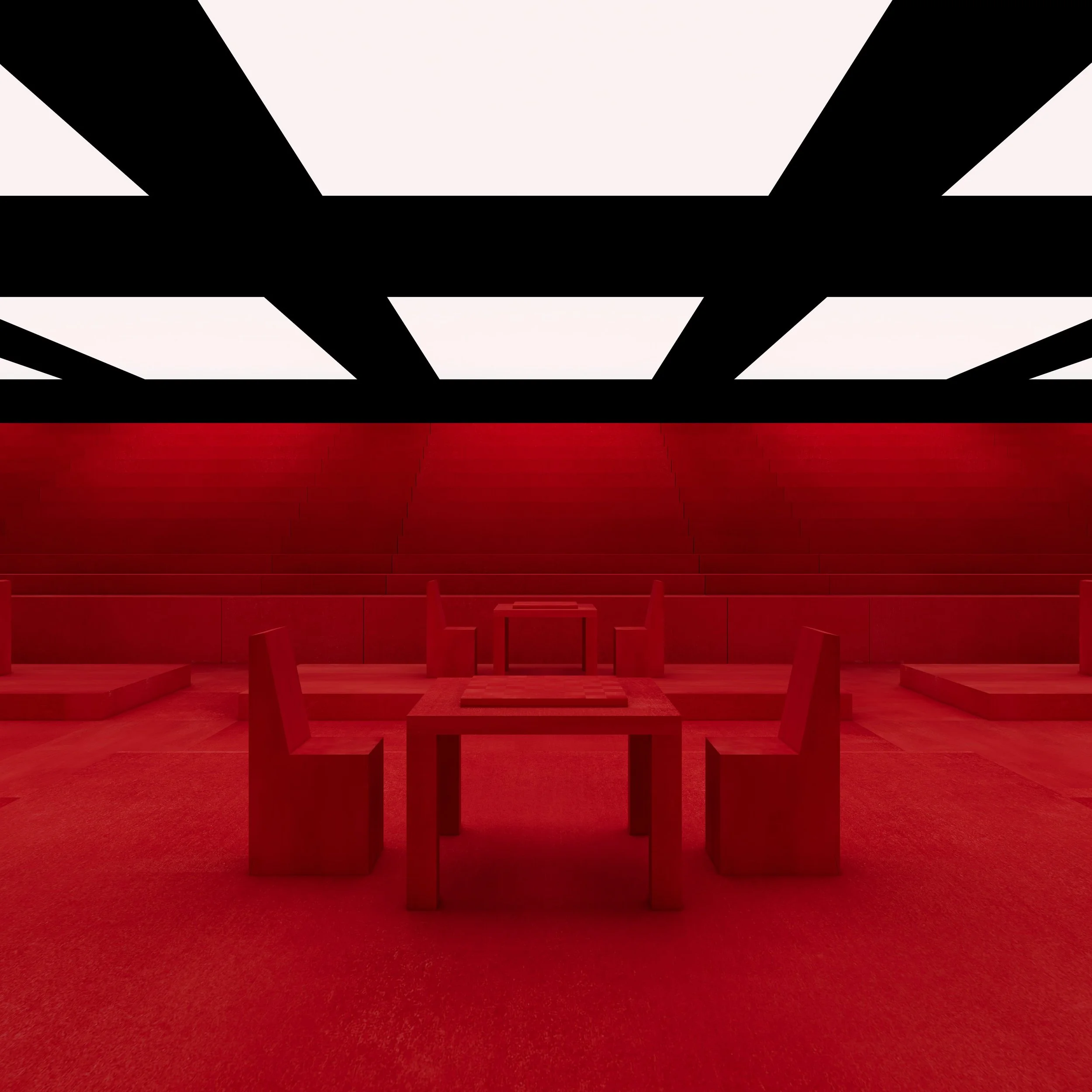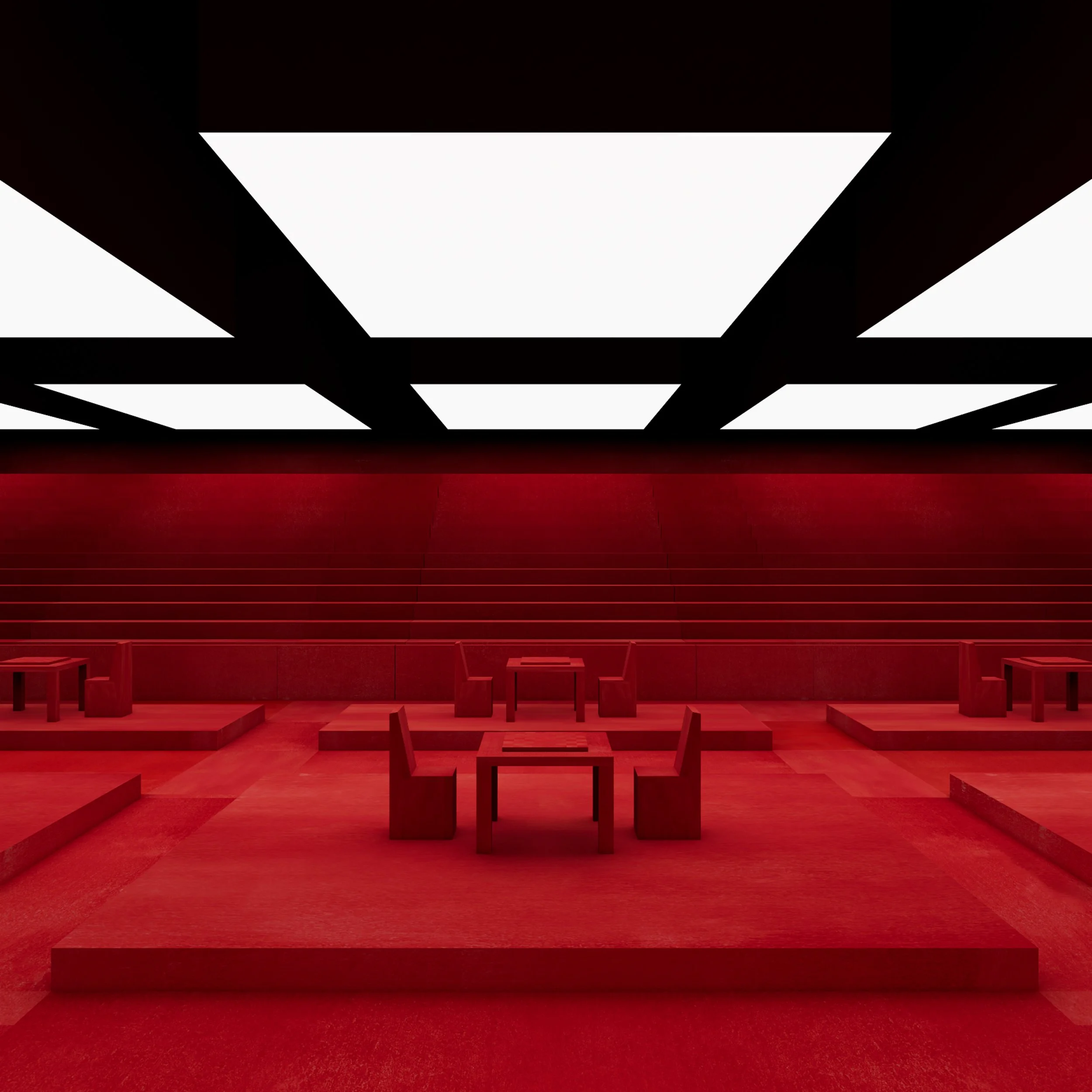 Red on red on red chess olympic court for the Chess Olympics. Individual competition pads are lightened beneath white light boxes observed as silent spectacles.