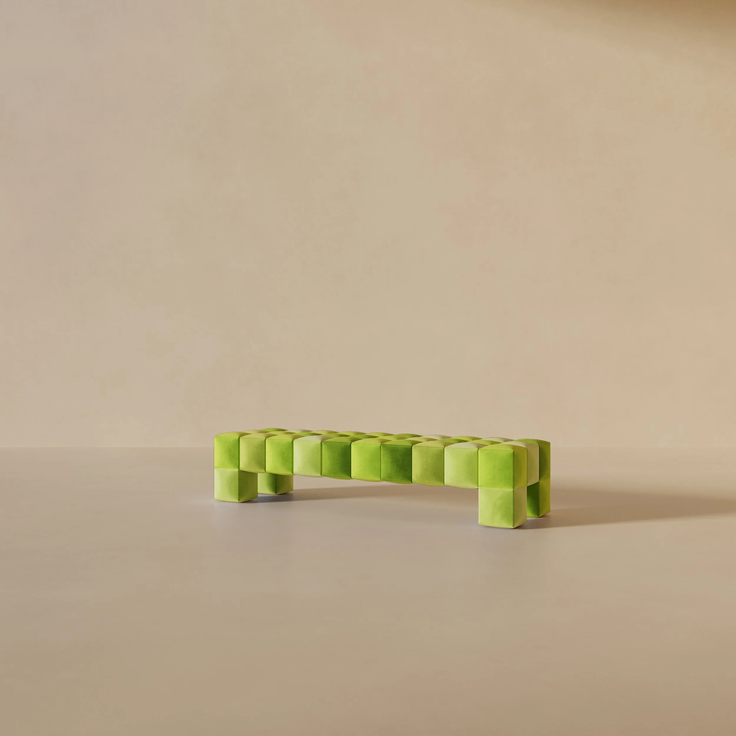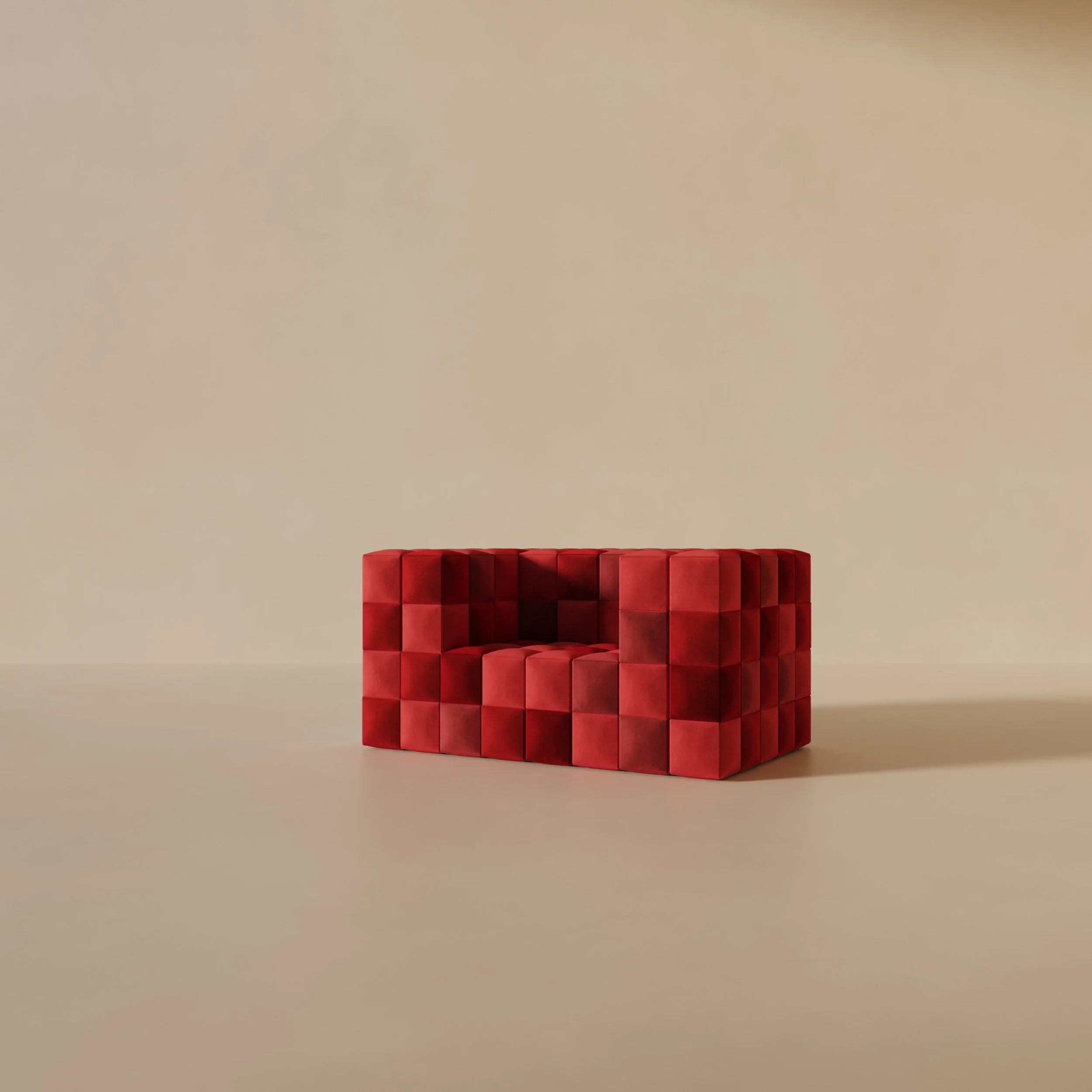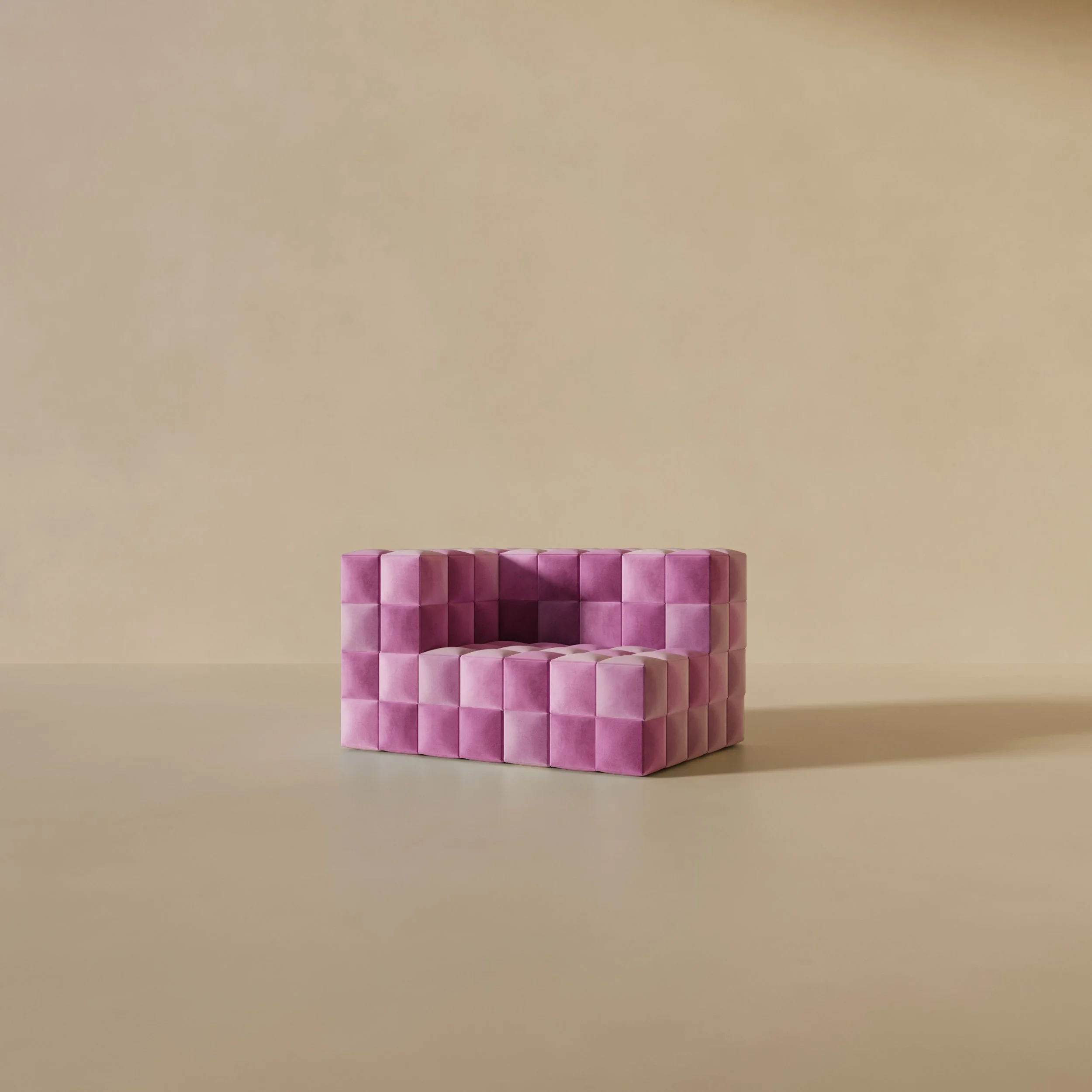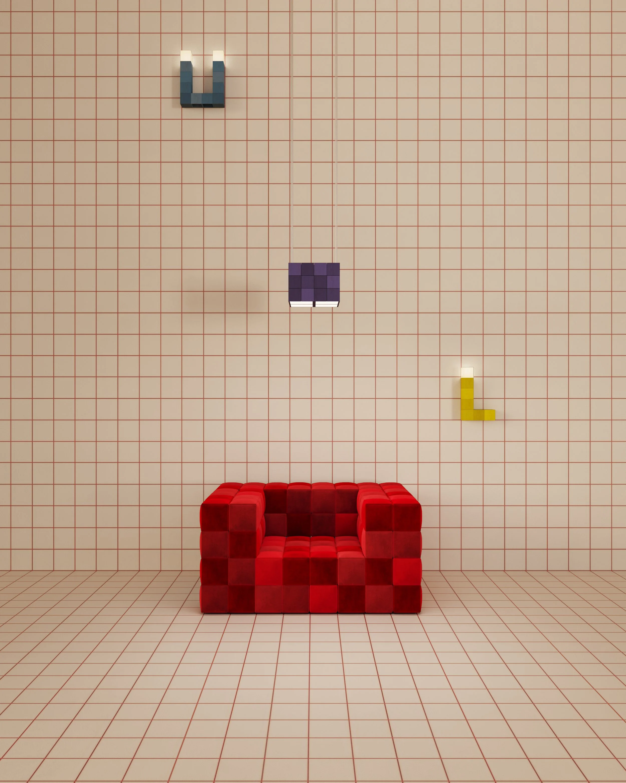 By bringing “the pixel” into three dimensions—something usually perceived as two-dimensional, the collection is a unique modular furniture series that takes shape directly from its digital origins. Across seating, lighting, and tables, the collection proposes objects that function as collectible furniture while also forming part of a larger grid of permutations. Referencing early video game aesthetics, the series collapses logic and play, function and imagination, into an open-ended investigation of form and resolution.