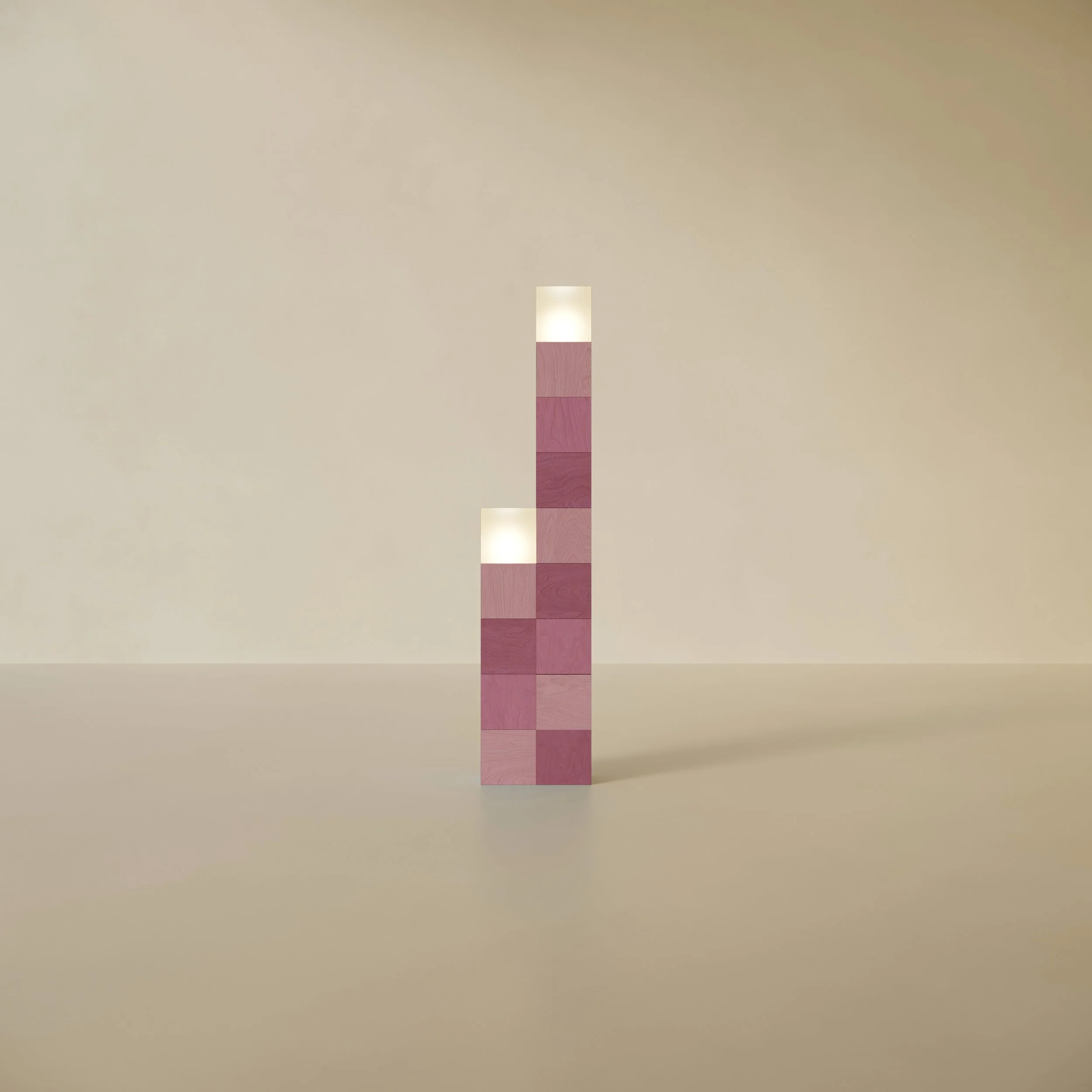 With Pixel Theory, I approach object-making with a simple logic: pixelated, modular, system-based, and open to variation. For the debut, the pieces are based on 3-tier resolutions of 5 cm, 10cm and 20cm between the seating, the floor lamp, the pendant light, the table lamp and the side table crossing between wood and velvet.