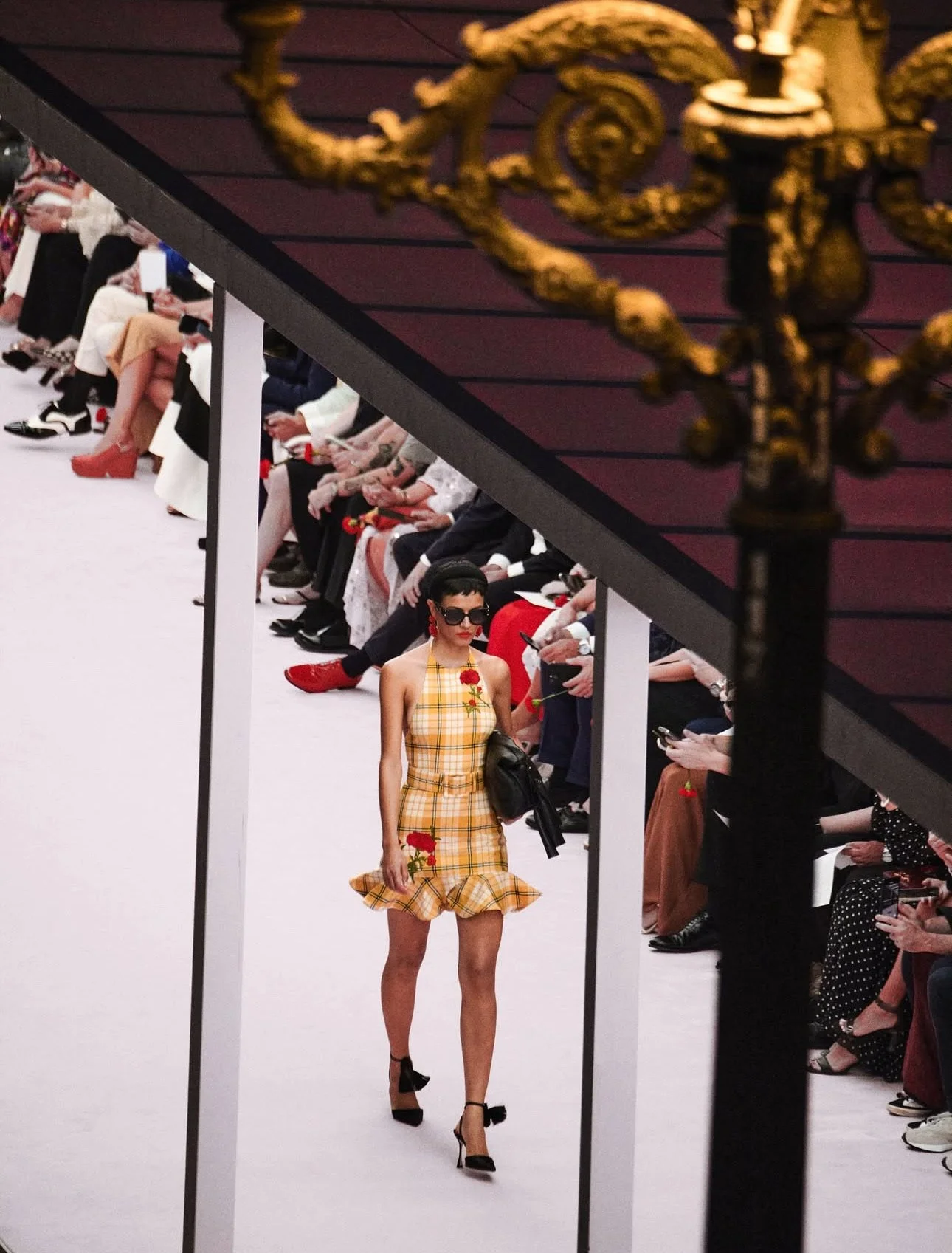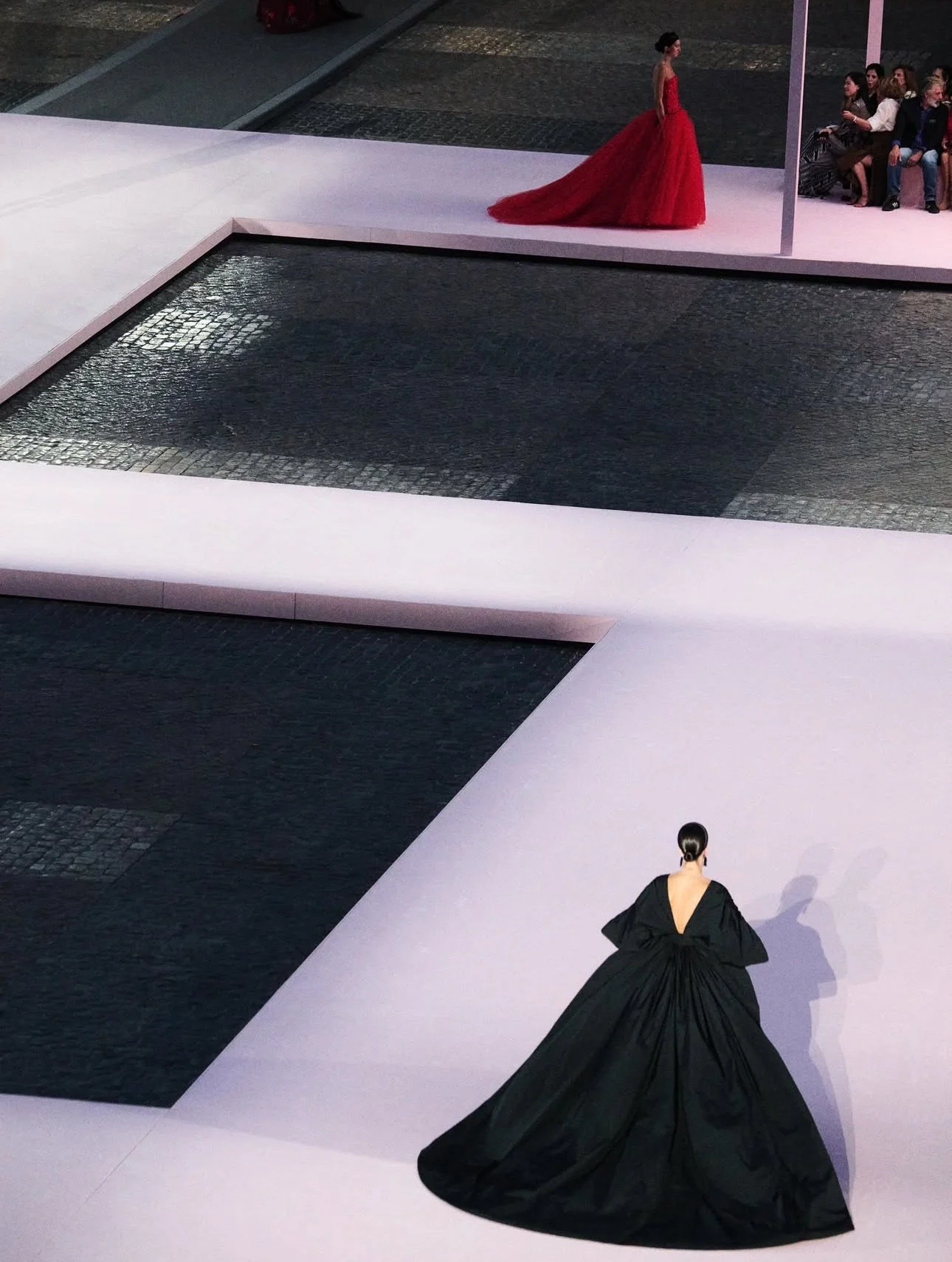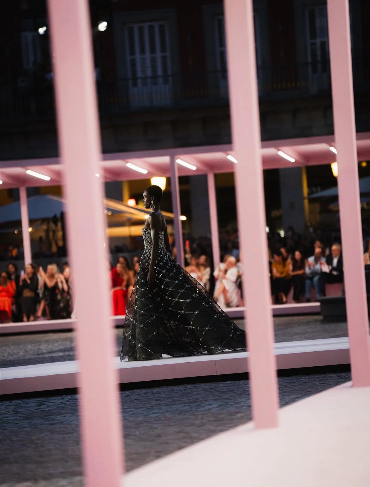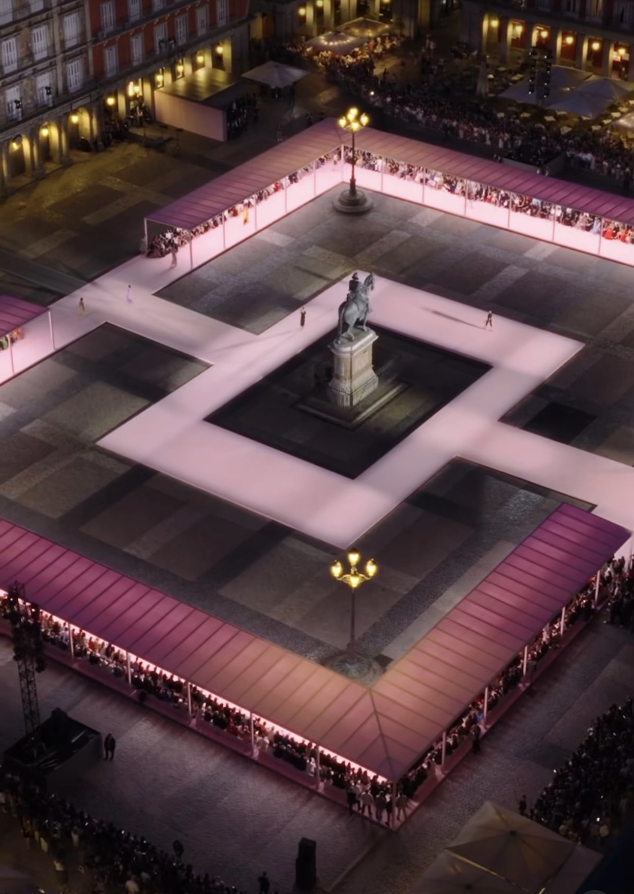 A 450-meter pale-pink runway curved through the square, the architecture bathed in soft evening light. The set design fused monumentality with the intimacy of place: sweeping surfaces, dramatic vistas, and bold colour turned the plaza into a house of Herrera.