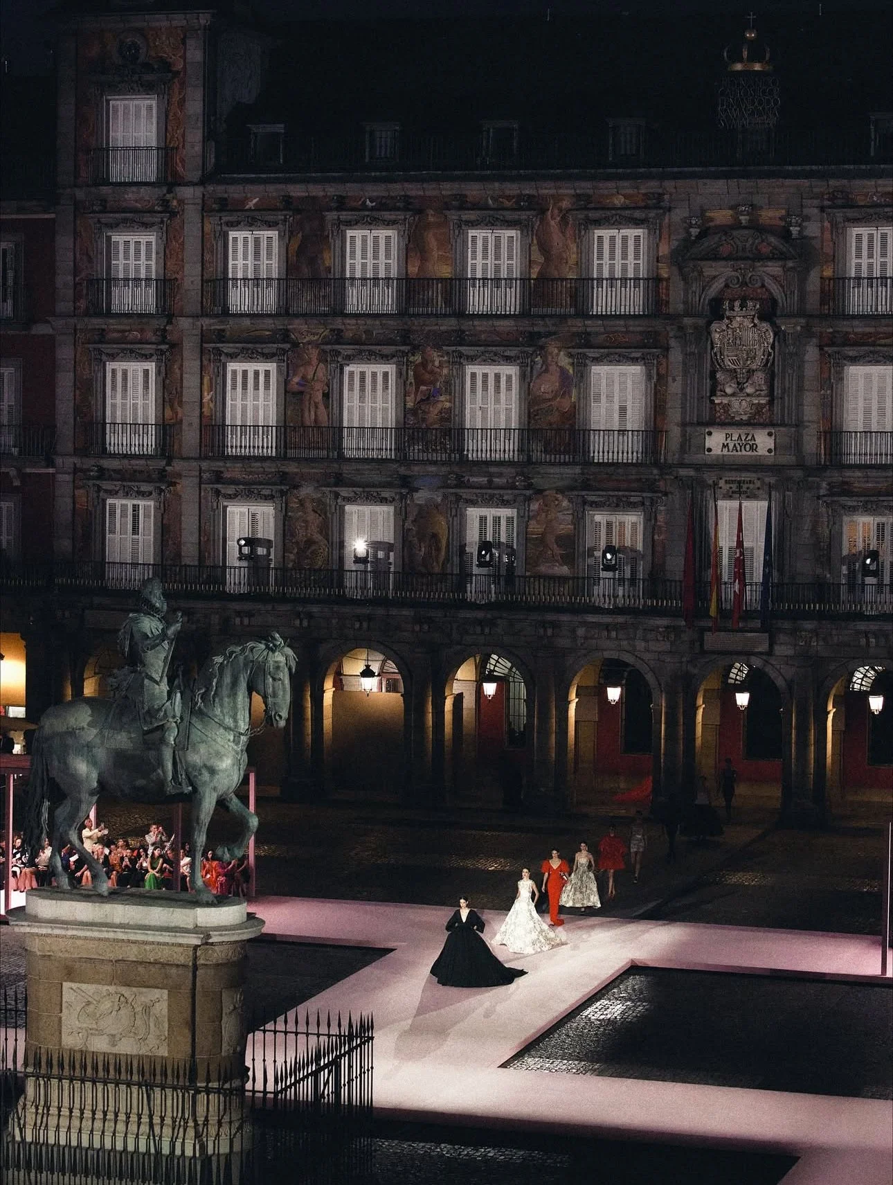 Carolina Herrera presented its Spring/Summer 2026 collection in Madrid’s historic Plaza Mayor, marking its first main runway outside New York. Inspired by the city’s 17th-century Golden Age and the vibrant ’80s Movida movement, the show fused heritage with a forward-looking vision.