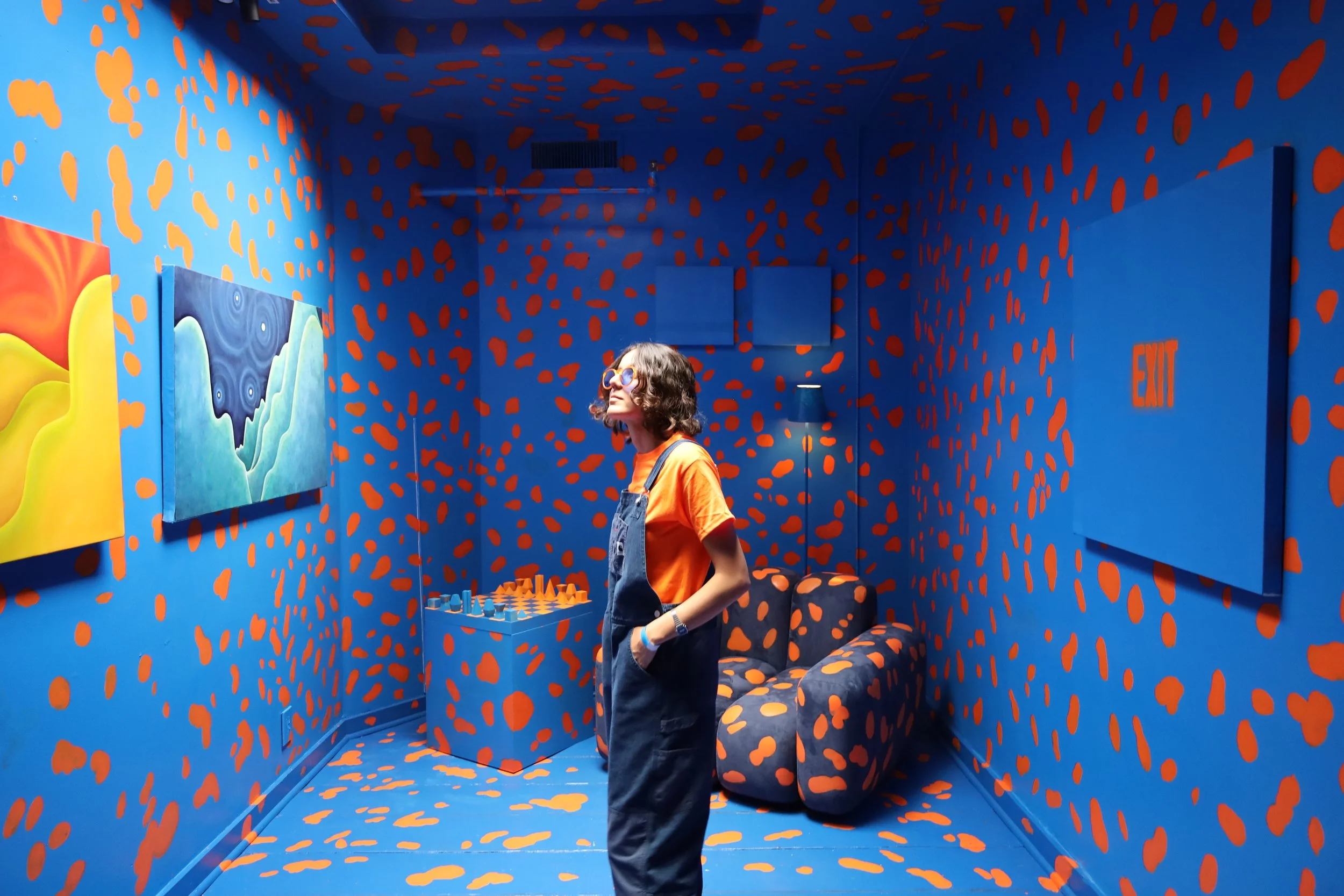 Took its name from, one of the iconic darker shades of Porsche, 002 - Dalmatian Blue is a handsome setting of a home in a dalmatian pattern. Curated with select designed objects, the room mimics a typical apartment setting in a monochromatic format. Flattened out at first sight, the room receives its dimension as the visitors step into the blue setting.